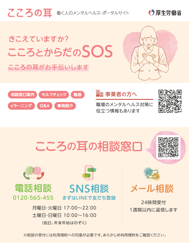 「こころの耳相談」 新着情報 2025.10.04 🌈 「こころの耳」電話相談やってます! モヤモヤしたら、話してスッキリしませんか? 専門スタッフが、やさしくお話を聞いてくれます🍀📞 0120-565-455(無料・匿名OK) 平日10〜22時/土日祝10〜16時 あなたの“こころ”、ひとりにしないで😊